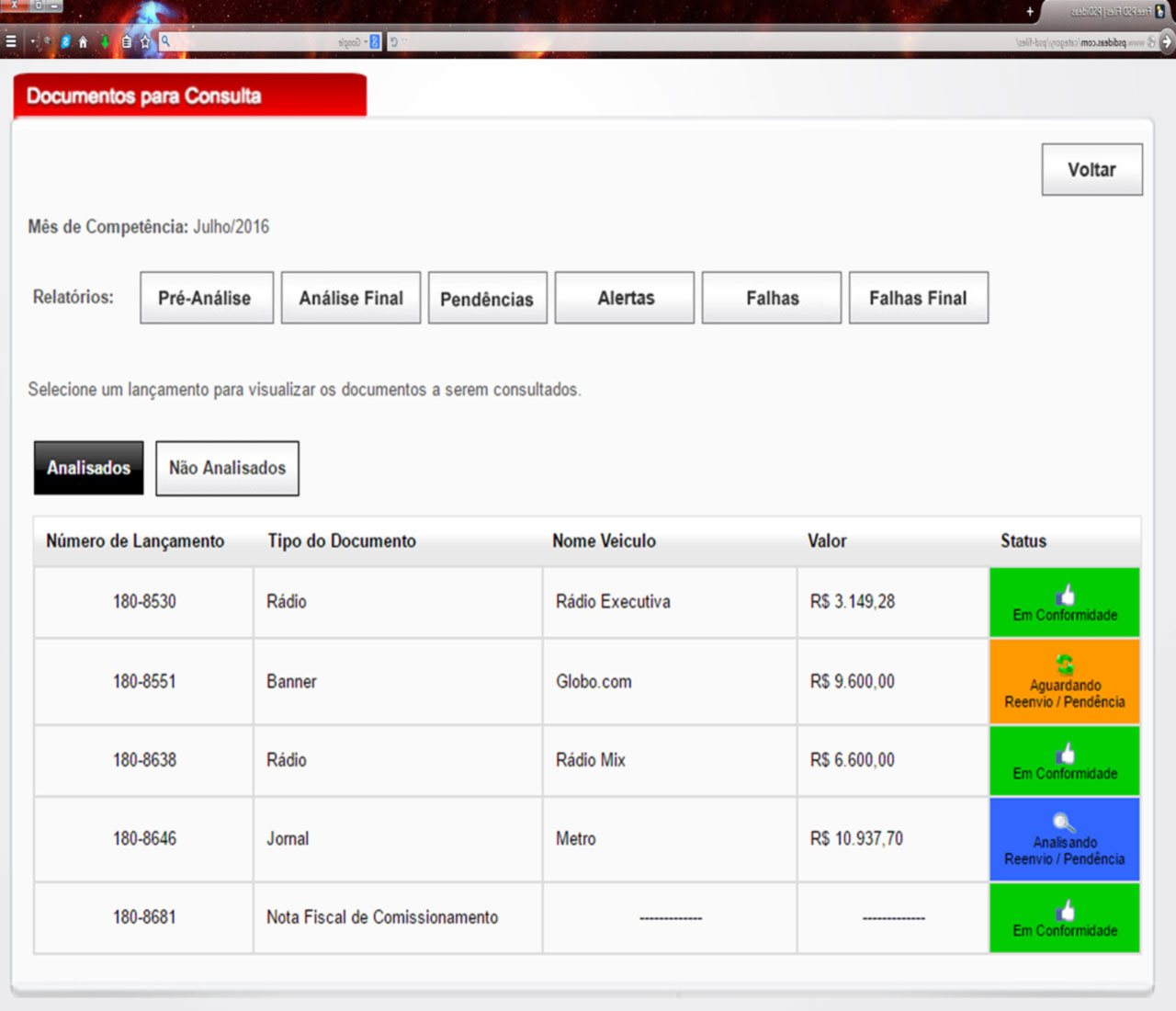 • Análise online de documentação e materiais recepcionados via WEB e respectivos resultados